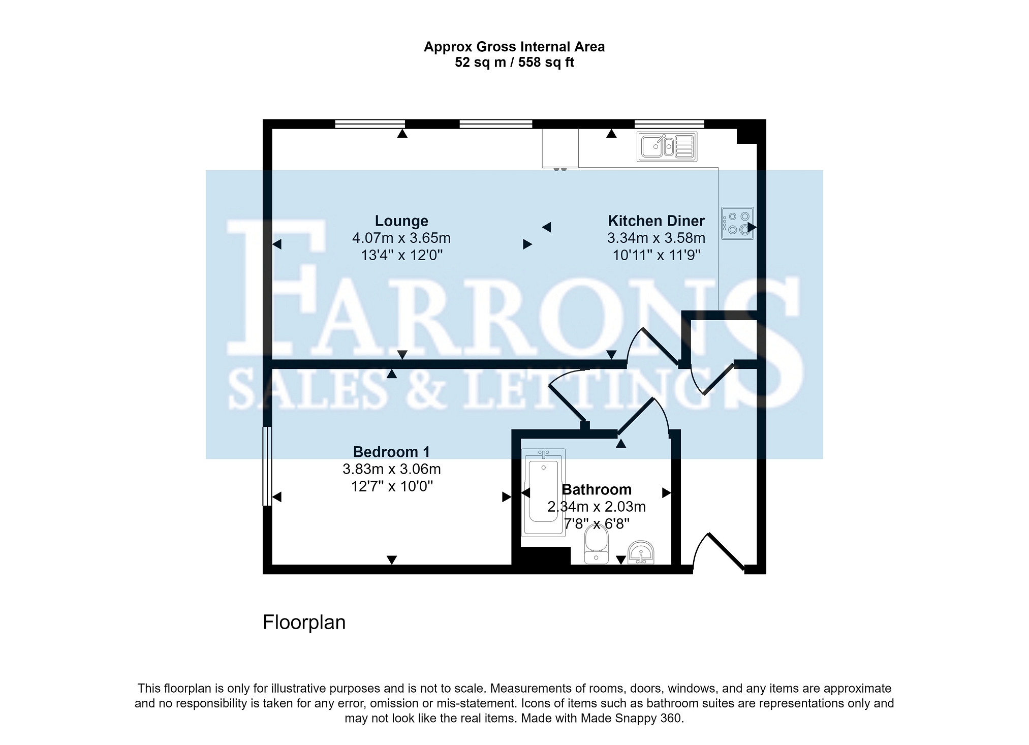 Impressive living space, flooded with natural light due to the three South/West facing Upvc double glazed windows. Two radiators. Part carpeted and vinyl tiles flooring. Extensive fitted kitchen with built in oven, gas hob and fridge/freezer. Gas boiler.
